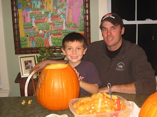 Dean and Cooper carved their pumpkins for Halloween tonight. Cooper doesn't quite grasp the whole carving/shadows with the candlelight concept so he draws whatever he wants and carves willy nilly! It's hard to bite our tongues and let him do that to a nice pumpkin...but it's his so what can we say?! Dean also carved Natalie's first pumpkin and I have yet to carve mine. Maybe while Dean is at work, Cooper is at school and Natalie is sleeping I will get it in! Those pictures along with Trick or Treating to come too.